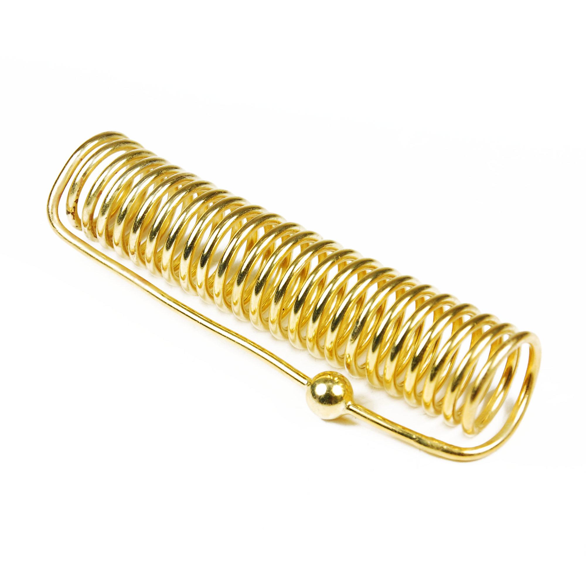 The Lost Cubit Acu-Vac Coil, 24K gold plated, measures about 5 inches in length. It weighs approximately 5.4 ounces. It is made from copper followed by a layer of silver and then 24K.